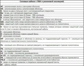 В зависимости от назначения и типа изоляции в электротехнике встречаются следующие маркировки кабеля: