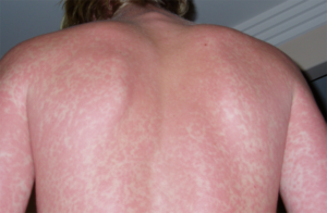 Сыпь. После того, как лихорадка спадает, как правило, появляется сыпь. Однако следует знать, что иногда сыпь при детской розеоле не появляется даже после сильной лихорадки. Сыпь состоит из множества мелких розовых пятен. Эти пятна, как правило, не ощущаются пальцами, но иногда могут быть и приподняты над уровнем кожи. Вокруг некоторых элементов сыпи могут быть белые кольца. Первые элементы сыпи обычно появляются на груди, затем сыпь распространяется на шею, лицо и конечности. Нередко сыпь ограничивается только туловищем, и пропадает, не успевая достичь лица и конечностей. Она не причиняет дискомфорта или зуда, длится от нескольких часов до нескольких суток, а затем исчезает, не оставляя за собой пигментации или шелушения.
