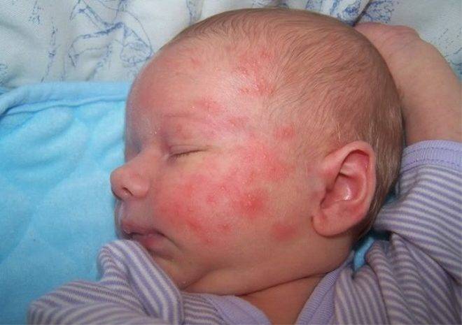 - Впервые появляется на волосистой части головы, шее и верхней половине туловища. На голове кожные высыпания достаточно плохо видны, если у малыша уже растут волосы. Однако у новорожденных деток красные пятнышки хорошо различаются.