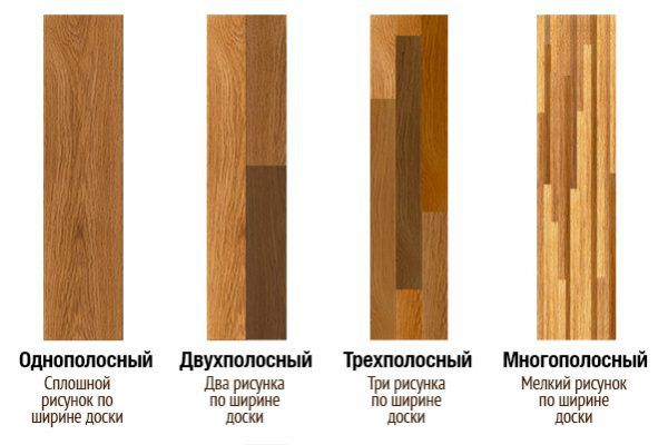 Вариантов цветовых решений огромное множество, от практически черного и до практически белого. По рисунку может быть одно-, двух- и трехполосным, декоративное покрытие имитирует штучный паркет или паркетные доски, натуральные доски различных пород. Конкретный выбор по внешнему виду следует делать с учетом существующего стиля оформления, размеров и назначения помещений.