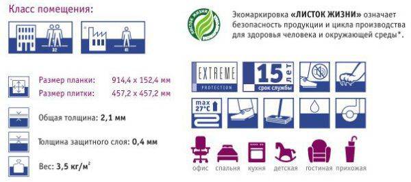 Износостойкость 33 класса AC 5, ударопрочность IC3, влагостойкость 18%.