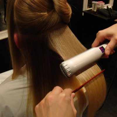 Кератиновое выпрямление проходит в три этапа. Первый — очищение шампунем. Затем наносится состав для кератинизации. После сушки пряди разглаживаются парикмахерским утюжком.