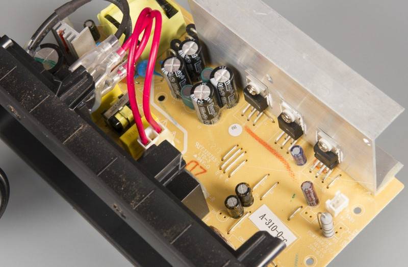 Здесь же закреплен мощный моноблочный усилитель, печатные схемы которого расположены на куске алюминиевого листа толщиной 3 мм, радиатор охлаждения выходных транзисторов. Для лучшего контакта радиатора с алюминиевой фольгой между ними нанесена теплопроводная паста. Выходные транзисторы устанавливаются на радиатор через изолирующую прокладку, также с использованием термопасты.