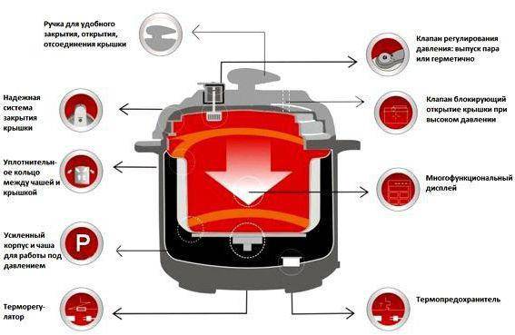 Данный аппарат включает в себя нагревательный элемент, работающий от электричества, паровую конструкцию, процессор, благодаря которому система работает автоматически, и кастрюльки для готовки.