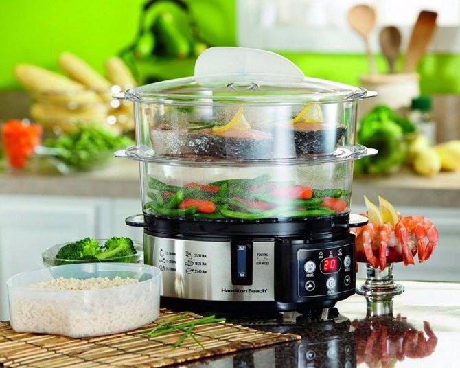 С помощью пароварки можно готовить одновременно несколько разных блюд, потому что данный агрегат оснащен несколькими специальными контейнерами для разных продуктов.
