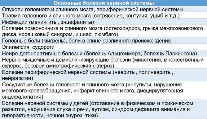 Это лишь примерный перечень основных недугов, на самом деле список болезней гораздо шире. В основном это недуги, которые характеризуются нарушением подвижности, из-за сбоя в работе нейронов и передачи нервных импульсов.