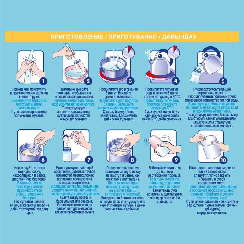 - Точно следуйте указаниям в таблице, не превышайте количество смеси и воды, чтобы не навредить малышу.