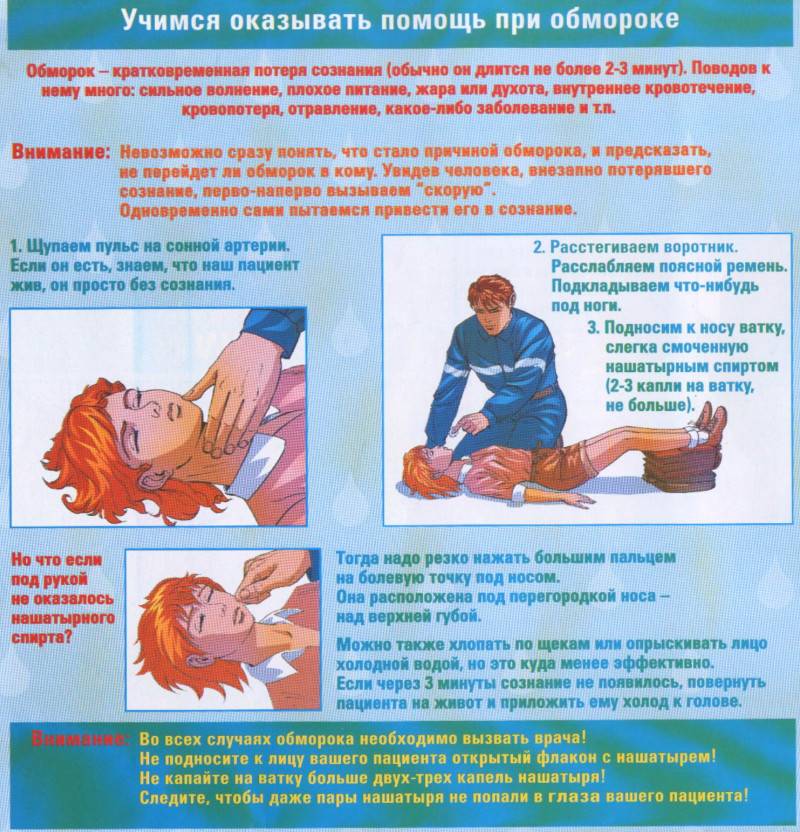 При обмороке первая помощь должна оказываться немедленно, так как причина этого состояния часто неизвестна, но может быть весьма серьезной. Бессознательного человека следует вынести из душного помещения на свежий воздух. Необходимо расстегнуть ворот рубашки. Проверьте наличие пульса на сонной артерии и спонтанного (самостоятельного) дыхания. Если они присутствуют, то поднесите к носовым ходам ватку, смоченную нашатырным спиртом.
