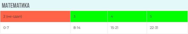 КИМ по математике включает 25 заданий, серди которых будут только вопросы базового и повышенного уровня сложности (высокого не предусмотрено, как и деления на профильный и базовый варианты). Максимальный балл – 31, но градация в 5-бальной системе определяется таблицей: