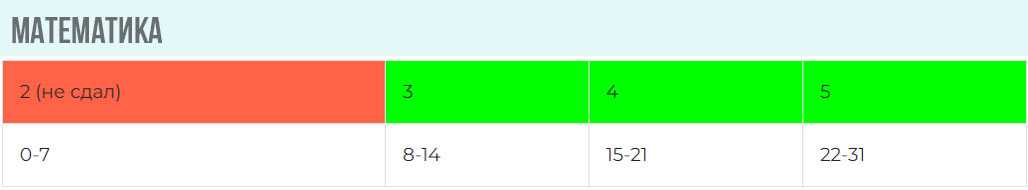 при получении от 0 до 7 баллов ставится отметка «2». От 8 до 14 баллов – оценка «3». От 15 до 21 – отметка «4». От 22 до 32 — выпускник получает оценку «5».