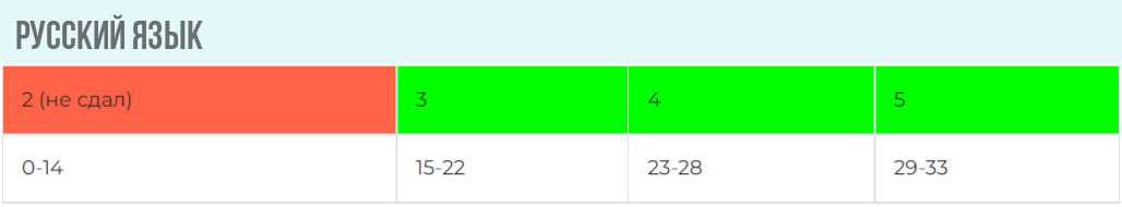 Максимально выполнив все задания по русскому языку можно набрать 33 балла, которые переводят в оценку по следующей таблице: