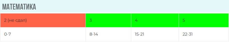 КИМ по математике включает 25 заданий, среди которых будут только вопросы базового и повышенного уровня сложности (высокого не предусмотрено, как и деления на профильный и базовый варианты). Максимальный балл – 31, но градация в 5-бальной системе определяется таблицей: