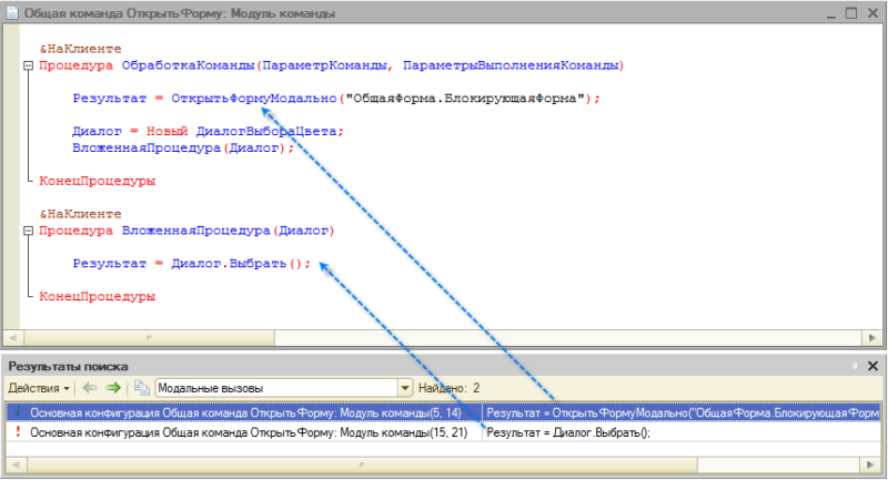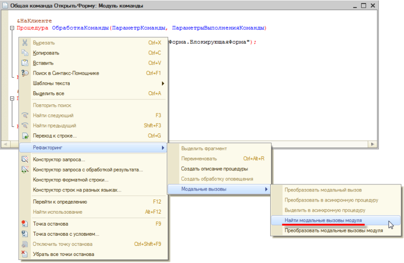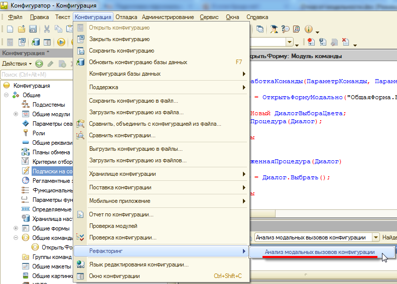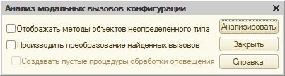 Можно найти все методы, открывающие модальные диалоговые окна. Для этого нужно выполнить проверку конфигурации с установленным флажком “Поиск использования модальности”.