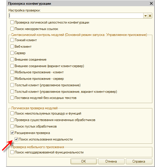 Проверка конфигурации – Расширенная проверка – Поиск использования модальности:
