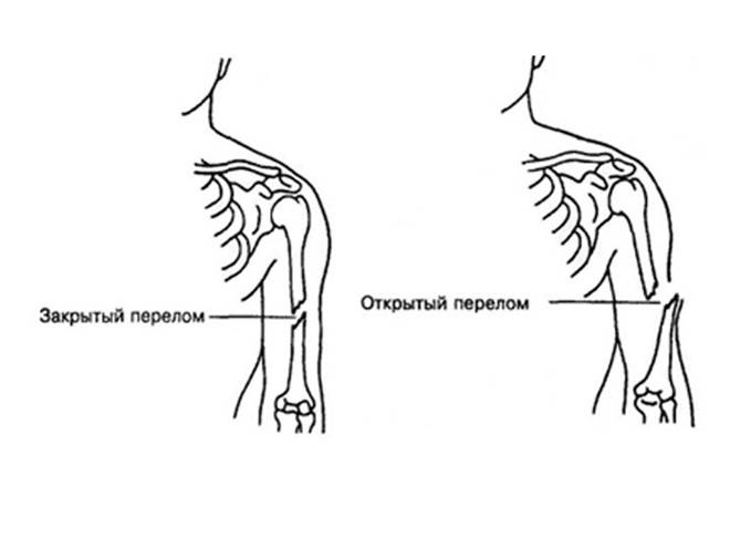В зависимости от расположения отломков костей, различают 2 вида переломов. Если целостность мягких тканей нарушена, перелом называется открытым. Если таких повреждений нет – закрытым.