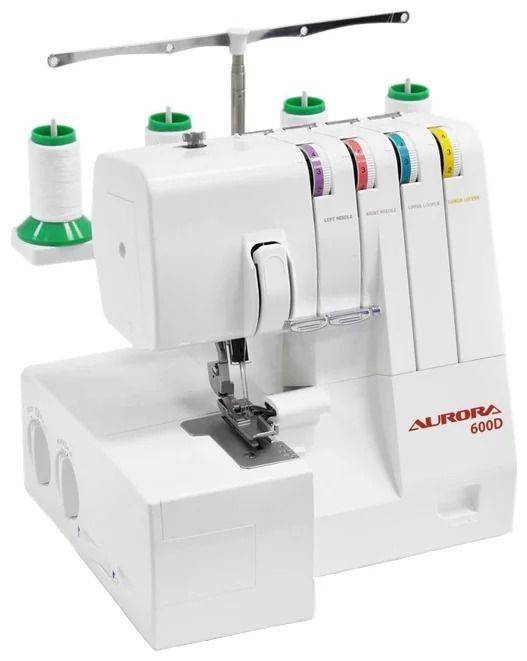 Устройство способно выполнять до 6 действий шитья, среди которых есть распошивальный шов и цепной стежок. Aurora 600D может выполнять двух-, трех- и четырехниточный шов. Длина стежков составляет от 0,01 до 0,04 см, а ширина – от 0,01 до 0,07 см. Имеется возможность поднятия лапки на высоту 5 мм. Прибор способен выполнять 1200 стежков за минуту. Оверлок данной модели оснащен ручным контролем натяжения. Мощность агрегата – 135 Вт.