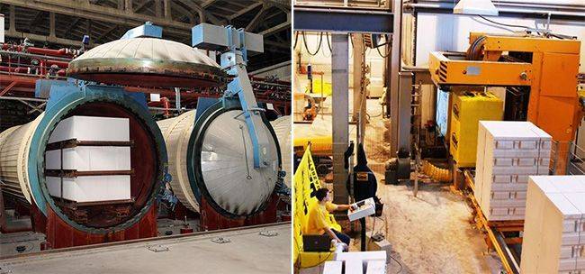 Для производства газосиликата применяют специальные устройства – автоклавы. Раствор заливают только в формы больших размеров. Обработка смеси происходит под действием пара, разогретого до температуры 180÷200˚С, и при повышенном давлении – от 9 до 13 атмосфер. За счет такой технологии удается достичь однородной структуры блока, равномерного распределения пузырьков газа и наименьшего разброса технических характеристик. После высыхания блоки разрезают с помощью специальных (струнных) пил, чтобы получить изделия необходимых размеров. При изготовлении газосиликата используют более дорогостоящее оборудование, чем при производстве пенобетона.