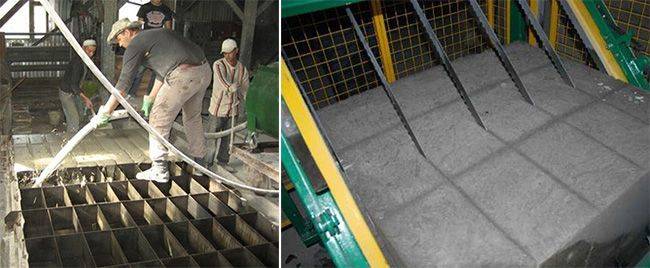 Чтобы получить формованный пенобетон, готовую массу разливают в формы, разделенные на секции, соответствующие размерам блоков. Высыхание и отвердевание изделий происходит естественным путем. Для получения резаного пенобетона используют большие формы. Застывшую массу разрезают на блоки при помощи специальных резательных комплексов.