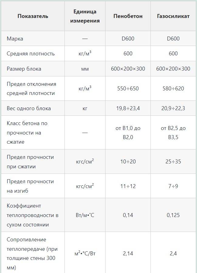 Для проведения сравнительного анализа сведем основные характеристики пенобетона и газосиликата в одну таблицу. Для примера возьмем конструкционно-теплоизоляционные блоки, рекомендованные ГОСТом для возведения несущих конструкций в малоэтажном строительстве.