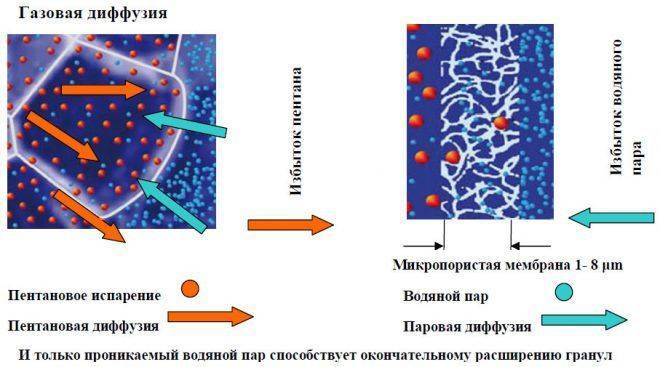 Гранулированный стиропор производится с использованием пентана, вещества способствующего образованию мельчайших пор, заполненных газом.