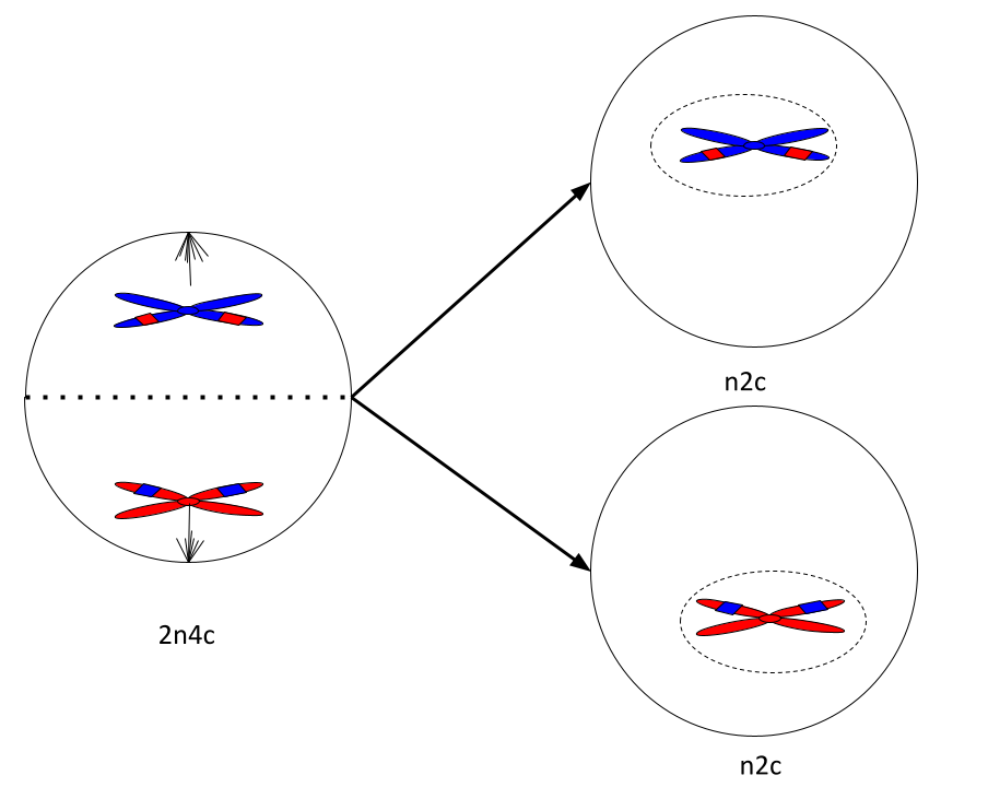 Его суть — изменение числа хромосом внутри клетки. То есть из одной диплоидной (2n4c) клетки получаем две гаплоидных (1n2c). Так стоп, откуда 4c? До этого же было 2n2c. Ах да… Сейчас разберемся.