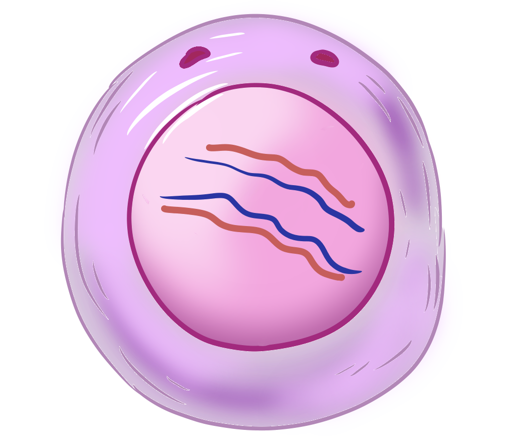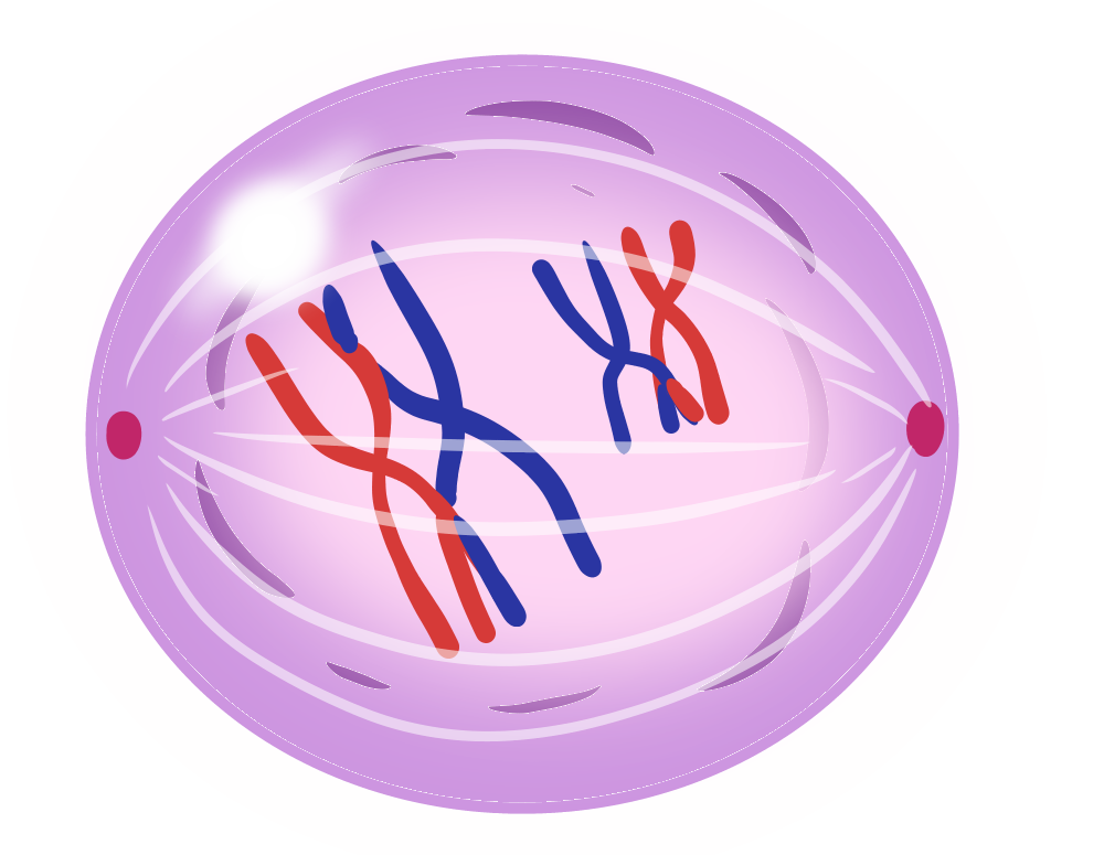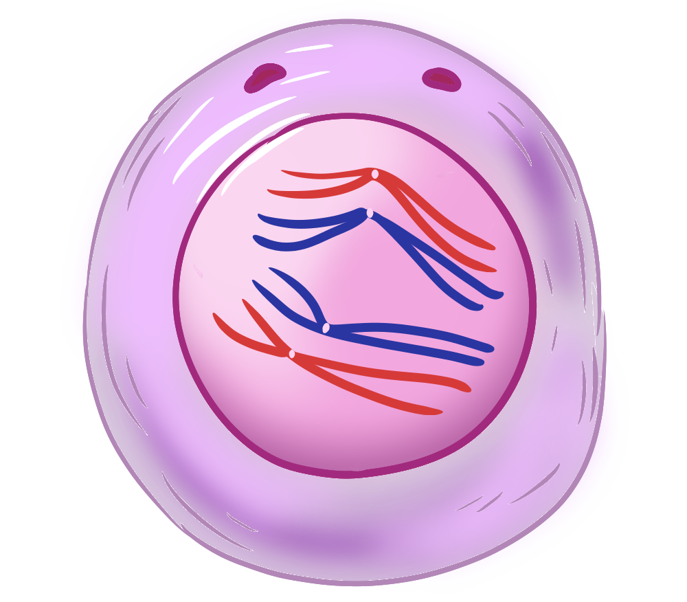 Какая основная задача у клетки? Правильно, передать генетический материал своим потомкам. Поэтому она начинает упаковывать молекулы ДНК как можно плотнее, она собирает чемодан, ведь не хочет ничего не потерять в пути. Этот процесс называется спирализация или конденсация хромосомы. Клетка так старается, что невидимые раньше в микроскоп хромосомы становятся видимыми. Они похожи на длинные и тонкие нити.