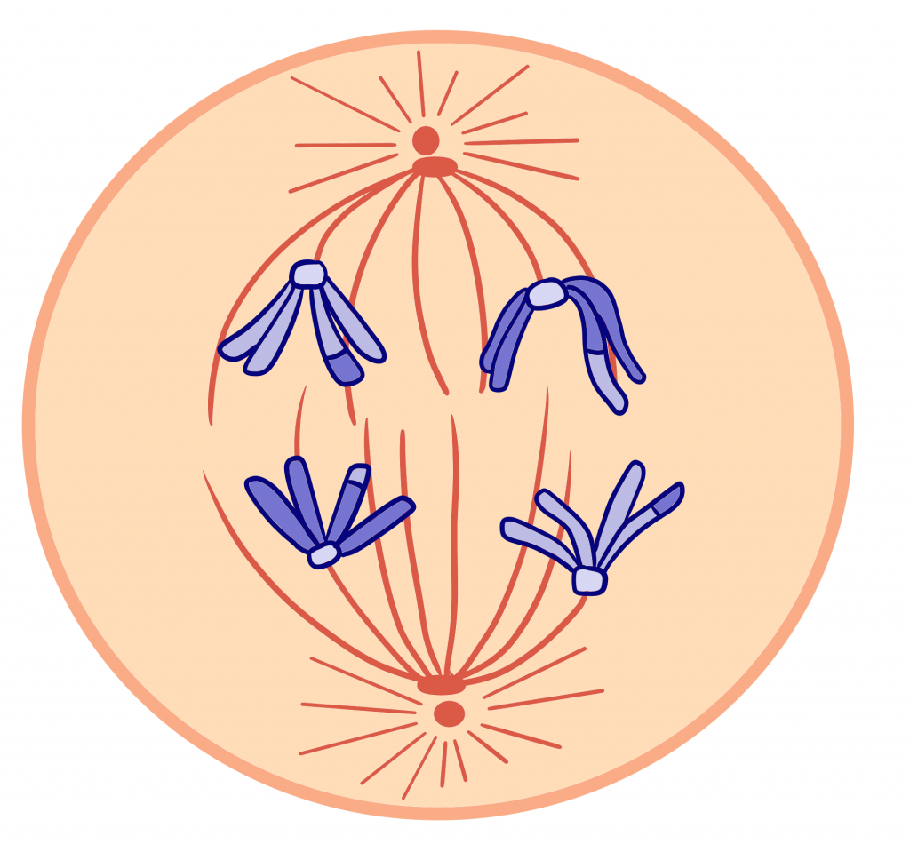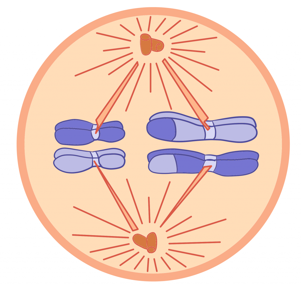 Нити веретена деления продолжают тянуть хромосомы на себя — они расходятся к полюсам клетки. На полюсах клетки располагается по 23 хромосомы, но они все еще состоят из двух нитей ДНК.