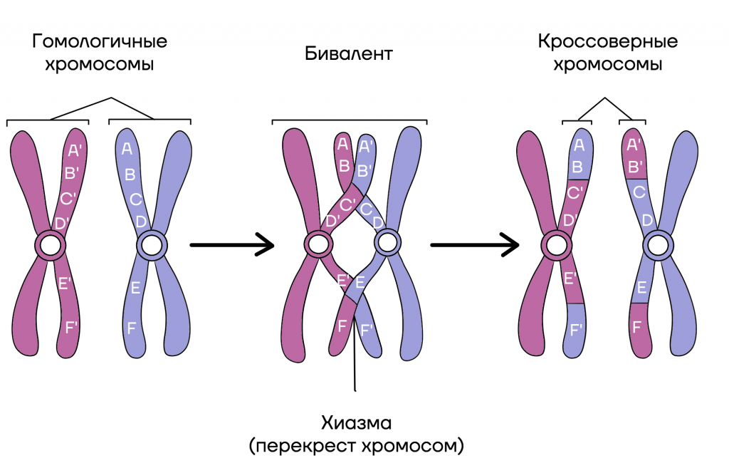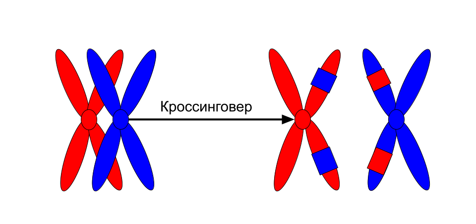 - Кроссинговер – процесс обмена схожими участками в составе половинчатых хромосом. Причем в процессе могут участвовать также несестринские хроматиды, имеющие идентичные участки. В узлах обмена формируются хиазмы.