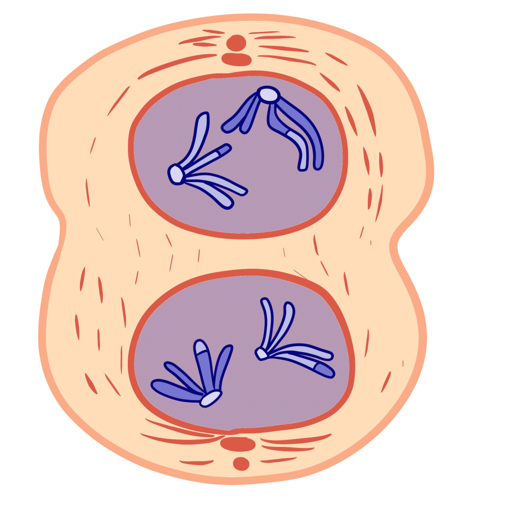 На этом этапе хромосомы достигают полюсов клетки и начинают разделяться снова. Клетка делится на две дочерних клетки, каждая из которых содержит только одну хромосому из каждой гомологичной пары. Образуются два гаплоидных набора хромосом. В некоторых организмах происходит образование цитоплазматического мостика.