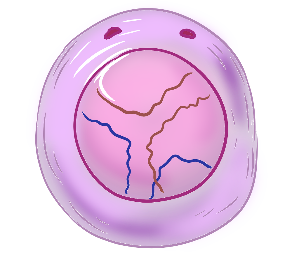 - G2 является коротким периодом после разделения цепочки, но до начала деления клетки. Клетка увеличивает содержание белков в своей структуре и растет. У нее все еще сохраняются нуклеолы, а ядро остается под защитой мембраны. Клеточные хромосомы удваиваются, но продолжают иметь вид хроматина.