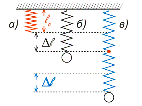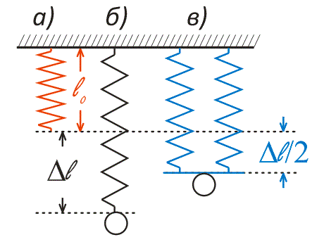 Рисунок 6а иллюстрирует свободно висящую пружину. Нагруженная пружина (рис. 6б), растянута на длину \(\Delta L\). Теперь возьмем две такие пружины и соединим их последовательно. Подвесим груз к этим (рис. 6в) пружинам.