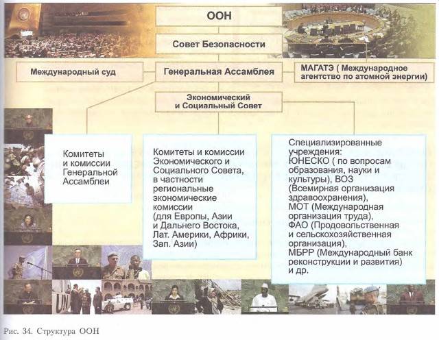 Современный мир не отличается единой политической организацией. Существующая международная система, основанная на изменчивом соотношении сил государств, переживает серьезный кризис. Как известно, к началу XX в. международный порядок олицетворяли шесть-семь великих держав с их колониальными империями, сферами влияния и политическими союзами. Первая мировая война сильно поколебала этот порядок, но не устранила его. Версальская система оказалась несправедливой, а созданная державами-победителышцами Лига Наций — недолговечной. Определенные надежды на установление миропорядка были связаны с учреждением после Второй мировой войны Организации Объединенных Наций (рис. 34), однако возникновение НАТО и Организации Варшавского договора не оправдало этих надежд. После окончания периода «холодной войны» и распада СССР международная политическая система не стала более стабильной.