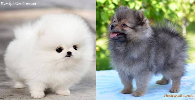 Даже непрофессиональный заводчик сразу же заметит разницу в этих видах. Помимо размеров (померанцы — исключительно карликовые собаки, немцы — карликовые, средние и большие), очевидно отличие в форме скелета. Немцы выглядят изящно и подтянуто. Тело вытянутое, напоминающее по форме прямоугольник. Выведенные карликовые питомцы более плотные, а корпус вписывается в квадрат, поэтому больше напоминают мишек.