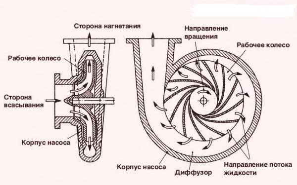Вихревые насосы имеют сходное строение с центробежными, только в них подвод воды осуществляется таким образом, что вода при попадании в камеру двигается по касательной относительно периферии и смещается к центру колеса, откуда под давлением и за счет движения лопастей вновь уходит на периферию, и уже оттуда выбрасывается через выходной патрубок. Основное отличие заключается в том, что при одном обороте колеса с лопастями (крыльчатки) цикл всасывания и выталкивания воды происходит много раз.