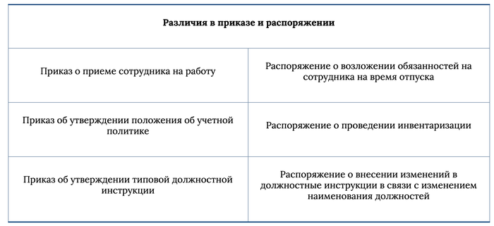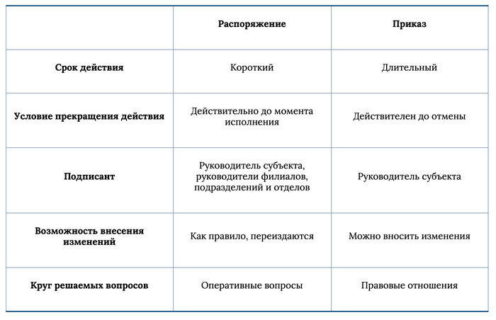 Есть также условные отличия приказа от распоряжения. Мы собрали их в таблице.