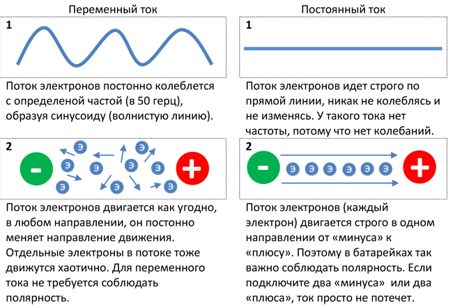 Разница между AC и DC заключается в их происхождении. Постоянный ток можно получить из гальванических элементов, например, батареек и аккумуляторов.