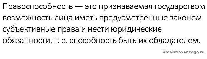 Правоспособность — это способность лица реализовать свои субъективные права и юридические обязанности, установленные законом.