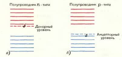 Оказывается, можно подобрать такие примеси, атомы которых легко отдают электроны. Освободившиеся при этом дополнительные уровни энергии располагаются внутри запрещенной зоны полупроводника вблизи ее верхнего края (рис. 4, а). Такие примеси называются донорными примесями, а уровни — донорными уровнями. Из рисунка 4, а видно, что при одной и той же температуре электронам с таких уровней гораздо легче перейти в зону проводимости, чем электронам из валентной зоны, поэтому примесные уровни и станут основными поставщиками электронов в зону проводимости. Но при этом в валентной зоне дырок появляться не будет, и проводимость полупроводника станет почти чисто электронной. Такие полупроводники называются полупроводниками n-типа.