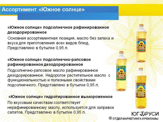 Таким образом, подсолнечное масло является универсальным продуктом, который может быть использован в различных кулинарных рецептах. В его кулинарном применении сосредоточены не только его вкусовые качества, но и его легкость, питательность и способность сохранять вкус и аромат блюд. Используйте подсолнечное масло для жарки, выпечки, салатных заправок, маринадов и соусов – и вы обязательно оцените его вкусовые и полезные свойства!