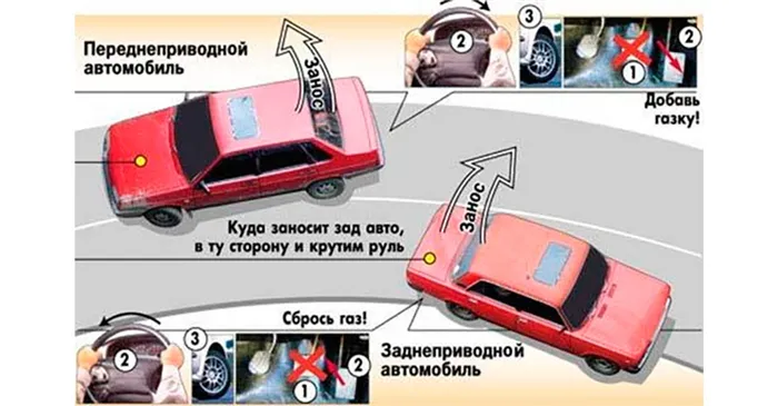 - Быстро повернуть руль в сторону заноса.