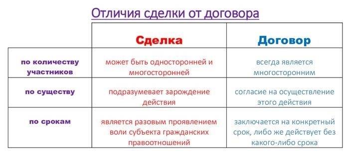Кроме перечисленного, различия между сделкой и договором заключаются в следующем: