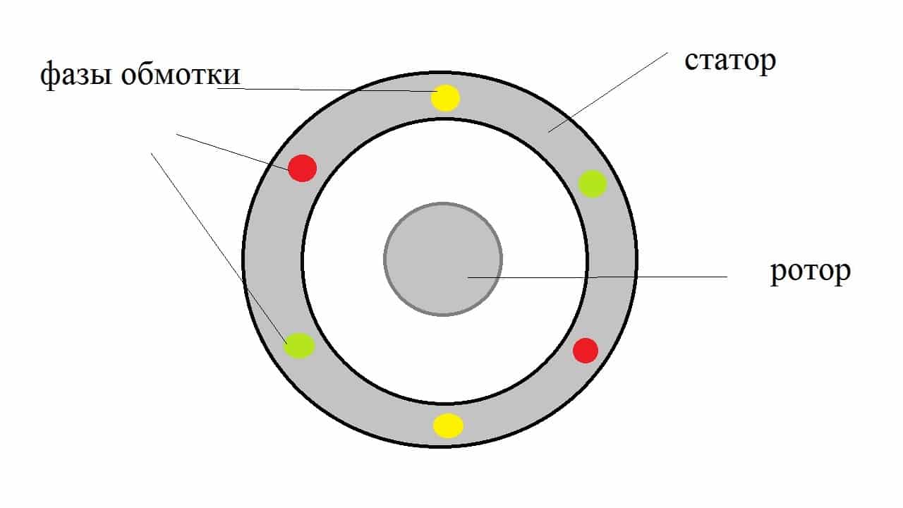 На рисунке показана принципиальная схема двухполюсной машины — по четыре паза на каждую фазу. При питании обмоток статора от трёхфазной сети получается вращающееся поле, так как токи в фазах обмотки, которые смещены в пространстве на 120° друг относительно друга сдвинуты по фазе друг относительно друга на 120°.