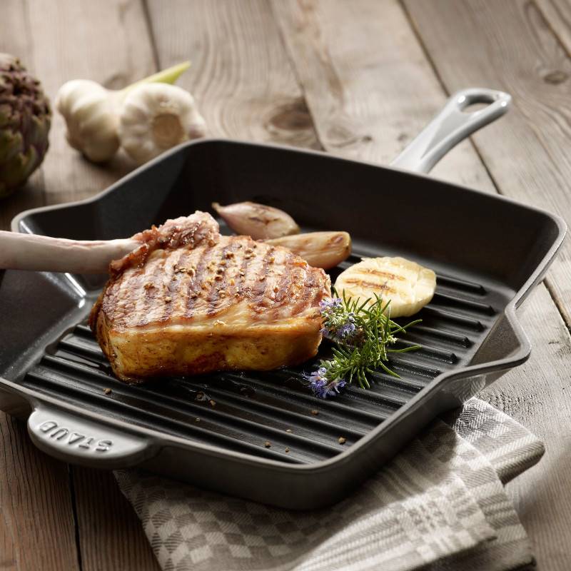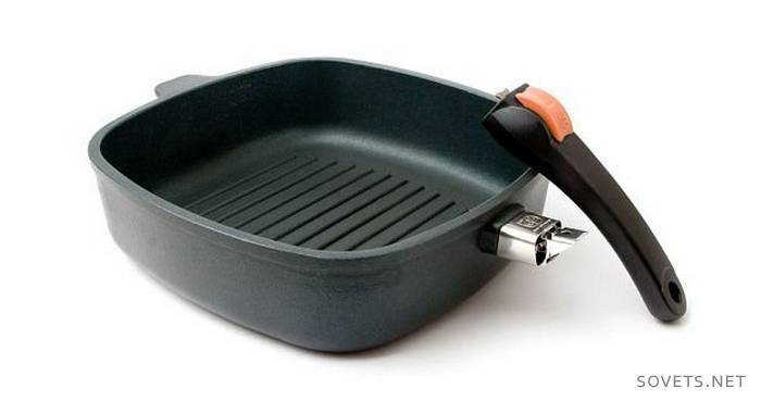 Ручка сковородки-гриль должна быть выполнена из жароупорного пластика, силикона или дерева. Увесистые модели из чугуна зачастую оснащаются цельнолитыми ручками, чтобы они не сломались под весом изделия в неподходящий момент. Невероятно практичны сковородки-гриль со складными ручками – они компактны и экономят место на кухне.