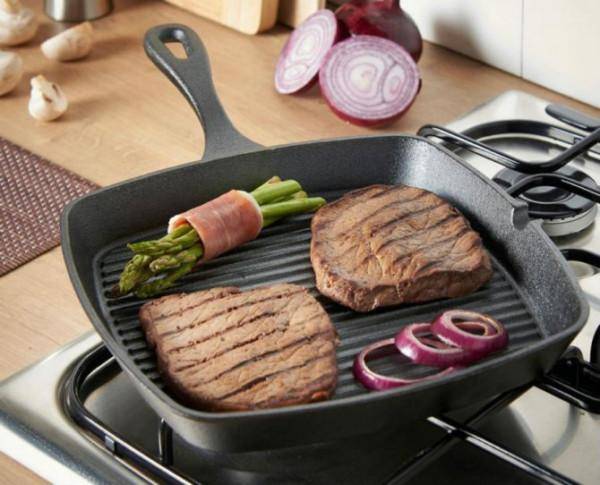 - Сковорода из чугуна. Изделия из этого материала прочные и долговечные. Идеально подходят для гриля, поскольку равномерно прогреваются и медленно остывают. К минусам относят значительный вес такой сковородки, а также явный металлический запах, исходящий от ее поверхности.