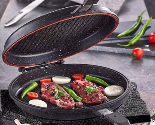 Внешний вид двухсторонней сковороды напоминает вафельницу. А также она обладает эффектом духового шкафа. Крышка фиксируется с помощью специального крепежного элемента и также нагревается. Такая посуда удобна тем, что блюдо не нужно регулярно переворачивать. Половинки этой модели закрываются на магнитные замки.