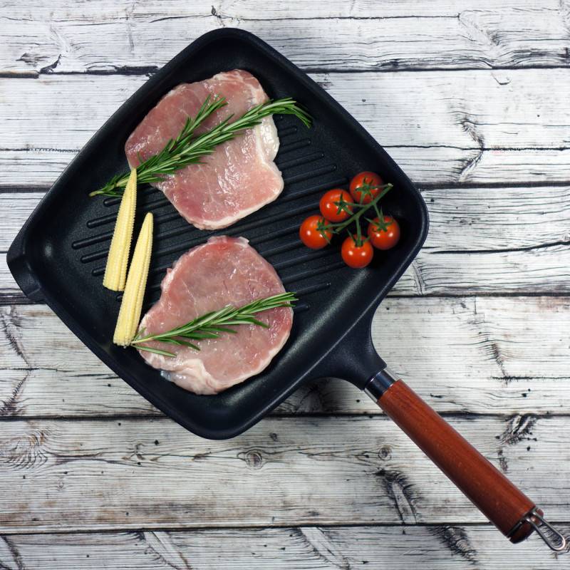 Материал, из которого изготавливают сковороды гриль, может быть чугунным или алюминиевым. Многие отдают предпочтение чугуну, так как он долговечен, имеет отличные жарочные свойства и практически не портится в процессе эксплуатации. Единственным минусом является большой вес. Такую сковородку будет тяжело поднимать. Алюминиевая посуда намного легче, за ней более удобно ухаживать. Она быстро нагревается и при наличии хорошего антипригарного покрытия отлично прожаривает продукты.