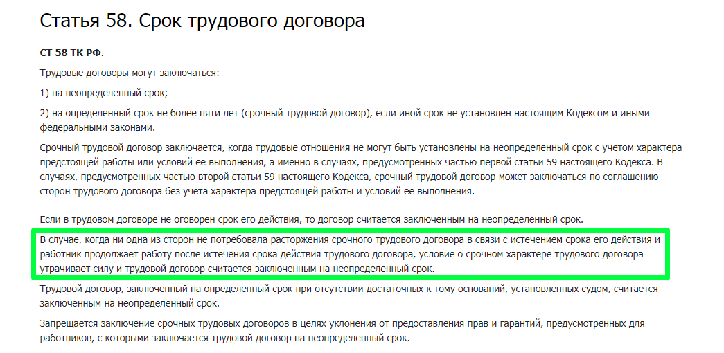 В том случае если по истечении срока срочного трудового соглашения работник продолжает работать на этом же месте, то договор автоматически переходит в разряд бессрочных договоров.