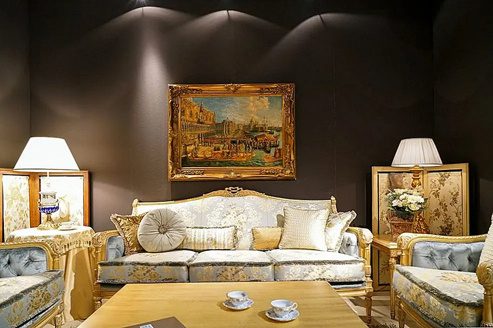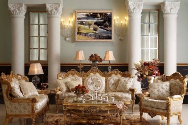 - Освещение должно быть ярким, поэтому помимо висячей хрустальной люстры, состоящей из множества деталей, в гостиной должны присутствовать бра и торшеры, а также подсвечники и канделябры (в этой роли могут выступать и стилизованные светильники).