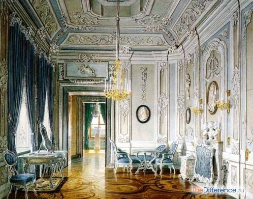 Маленькие комнаты с невысокими потолками. Стены обиваются деревянными панелями, текстилем. Изобилие тончайшей резьбы, лепнины и позолоты на потолке и стенах. Узорчатый паркет и ковры на полу. Отсутствие контрастности. Элементы декора сливаются в единую композицию. Обилие мелких украшений и завитков