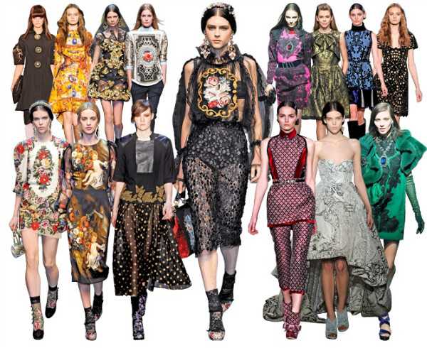 Внимание к образу женщины привлекается сразу же, когда смотришь на объемные цветы и красивые кружева. В современных тенденциях создаются стильные орнаменты из цветов и листьев. Актуальны также такие материалы как бархат и парча, что очень схоже со стилем барокко